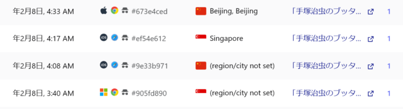 で、シンガポールに比べると少ないが、「中国」からのアクセスもたまにある。
