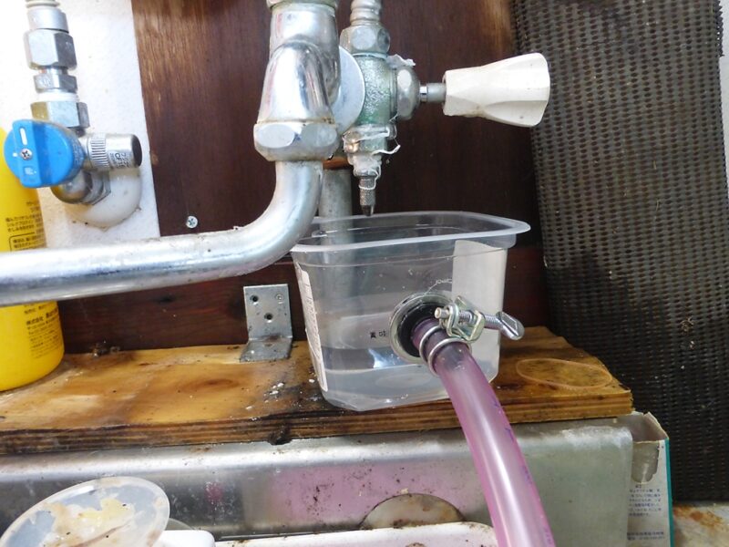 で、一寸頭をひねり、その容器から細いホースを使い、流し台に水を抜くことにした。