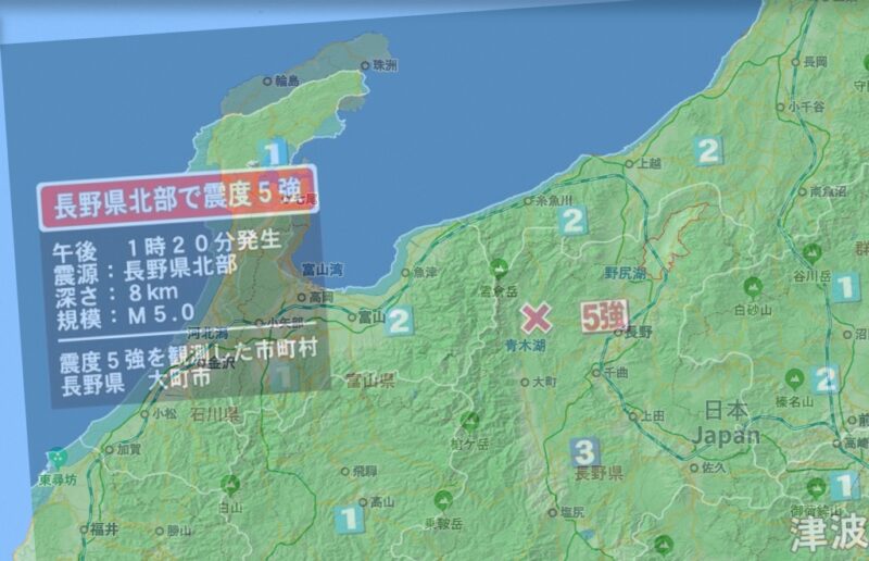 最初の地震警報と次の地震警報は「震度5」となっていて、その後の3つは「震度3」となっていた。
